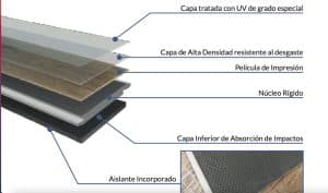 Los suelos vinílicos son 100% sintéticos, están formados por una primera capa protectora, una capa decorativa con el diseño, en su núcleo por SPC y una capa inferior de espuma de polietileno reticulado.